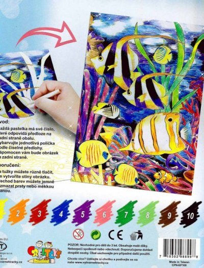 Postup: Každá pastelka má své číslo, které odpovídá předloze na zadní straně obalu. Vybarvujte jednotlivá políčka podle číselné předlohy. Nápomocen vám bude obrázek na zadní straně.