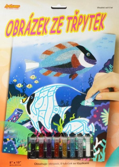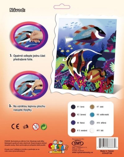 Opatrně odlepte jednu část předražené fólie. Na vzniklou plochu nasypte vybrané třpytky. Opakujte dokud není obrázek hotový.