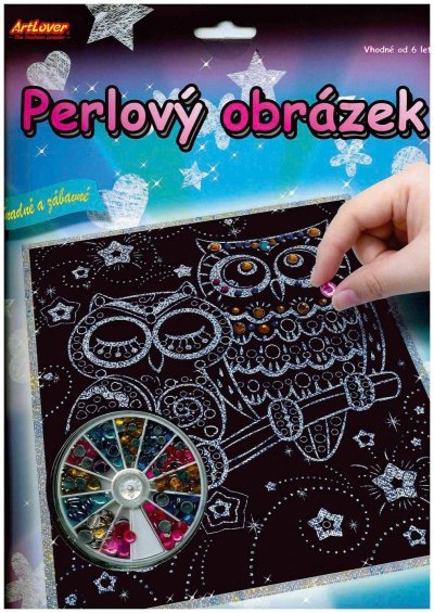 Odstraňte ochrannou fólii z podkladového obrázku. Nalepujte jednotlivé perličky do předtištěných míst. Perly vybírejte tak, aby jejich velikost odpovídala velikosti předtištěných míst na obrázku.