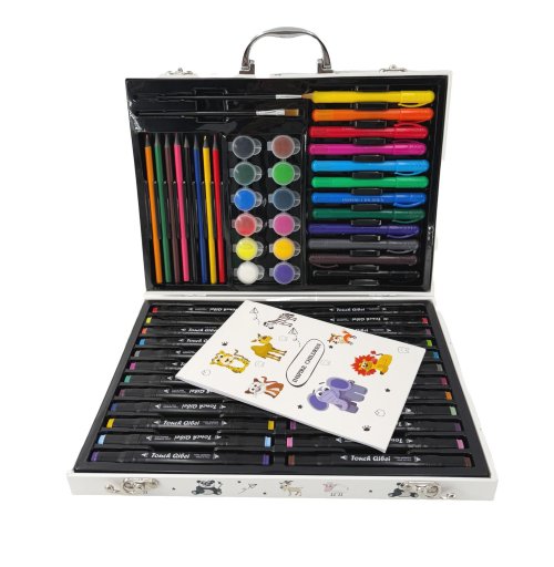 ARTO Výtvarný kufřík - Zvířátka je ideální dárek pro všechny malé umělce a milovníky zvířátek. V balení jsou i roztomilé omalovánky se zvířátky.Podněcuje kreativitu, fantazii a jemnou motoriku. Celý kufřík je navržen tak, aby byl praktický a snadno přenosný. Všechny pomůcky mají své přesně vymezené místo, takže se v kufříku udržuje pořádek a nic se neztratí. Díky pevnému uzávěru se nemusíš bát, že se kufřík samovolně otevře.A co se skrývá uvnitř tohoto zvířecího království? Otevřením kufříku objevíš bohatou výbavu pro malé i velké milovníky přírody a zvířat:Pastelky: Sada barevných pastelek v přírodních i pestrých odstínech, které hladce kloužou po papíře a umožní ti vykreslit i ty nejjemnější detaily srsti, peří nebo šupin.Oboustranné fixy: Jasné a syté fixy pro výrazné obrysy a vyplňování větších ploch. S nimi oživíš barevné peří papouška, pruhy zebry nebo skvrny dalmatina. Z jedné strany mají fixy tenký hrot a z druhé jako zvýrazňovač.Vysouvací voskovky: Hladké voskovky s bohatou pigmentací, ideální pro nanášení vrstev a vytváření různých textur – od hebké kočičí srsti po drsnou kůru stromu, na kterém sedí veverka.Tekuté vodové barvy: Paleta vodových barev v zemitých i jasných tónech. S trochou vody a štětce můžeš vytvářet jemné stínování a prolínající se barvy, které dodají tvým zvířecím portrétům živost.