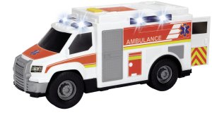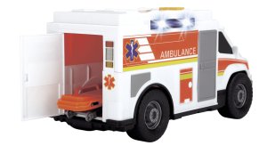 Auto ambulance na volnoběh. Světelné a zvukové efekty. Otevírací zadní dveře. Součástí jsou i nosítka. Délka 30 cm.