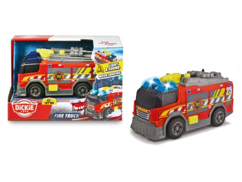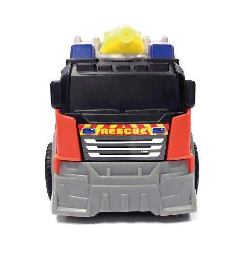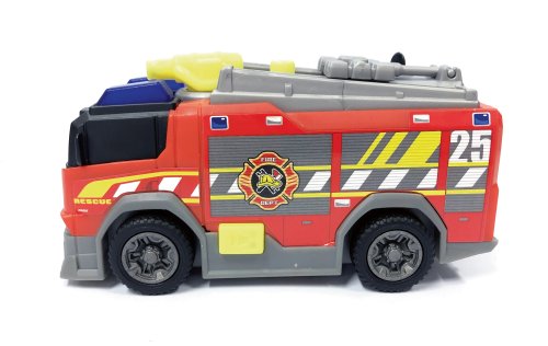 Hasičské auto na volnoběh, světelný a zvukový efekt. Stříkačka na vodu manuální, pohyblivý žebřík. Délka auta 15 cm.
