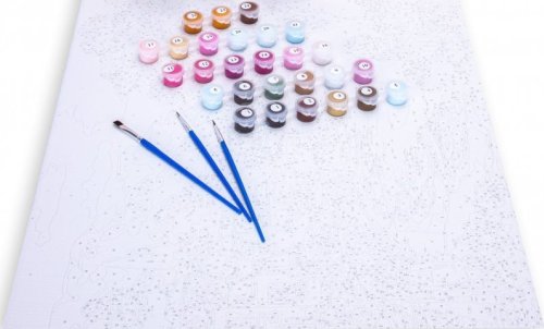 Balení obsahuje: plátno na rámu, 20-30 barev, 3 různé štětce, háčky na zavěšení.