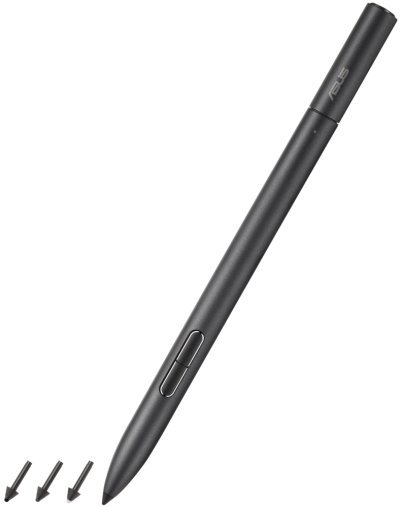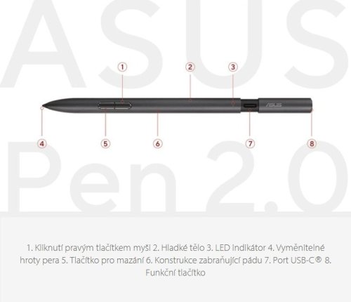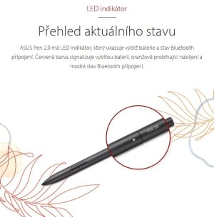 Aktivní dotykové pero ASUS Pen 2.0 je ideální pro psaní poznámek či kreslení na dotykovém displeji. Pracuje s technologií MPP 2.0, která nabízí velmi krátkou latenci a rychlou odezvu. Citlivost až 4096 úrovní tlaku a síla hrotu pera 5 až 350 g vám umožní zaznamenat nejjemnější linie i široké tahy štětcem. Stylus podporuje párování přes Bluetooth pomocí jednoho kliknutí a nabízí několik přednastavených zkratek pro snadnější ovládání. Funkční tlačítka zahrnují jedno horní tlačítko pro klávesové zkratky a dvě boční tlačítka určená pro klikání myší a mazání. Nabíjení je řešeno pomocí USB-C konektoru pro rychlé nabití za 30 minut, které zajistí více než 140 hodin provozu.