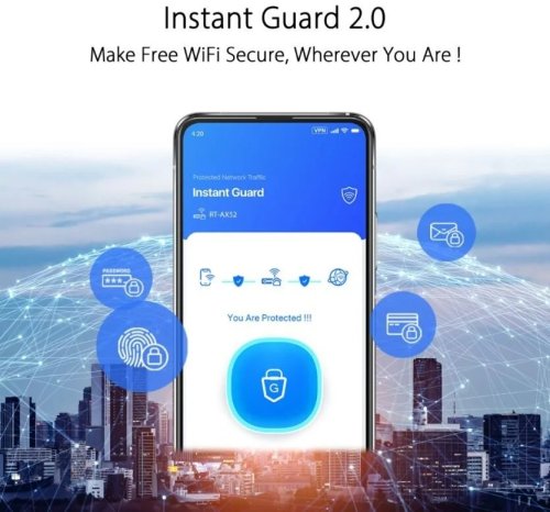 Bezplatná veřejná WiFi síť je málokdy bezpečná. Díky VPN technologii Instant Guard můžete prostřednictvím routeru RT-AX52 bezpečně surfovat na veřejné WiFi síti a nastavit ji jediným kliknutím. Navíc je zcela zdarma!
