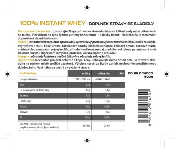 Složení: Banán: instantní nízkoteplotně zpracovaný syrovátkový proteinový koncentrát (z mléka), emulgátor slunečnicový lecitin, aroma, zvýrazňovač chuti a vůně E640, aroma, sladidlo - sukralóza, barvivo - kurkumin, patentovaná směs trávících enzymů Digezyme® (amyláza, proteáza, laktáza, lipáza a celuláza). Čokoláda: instantní nízkoteplotně zpracovaný syrovátkový proteinový koncentrát (z mléka), emulgátor slunečnicový lecitin, zvýrazňovač chuti a vůně E640, aroma, kakaový prášek, sladidlo - sukralóza, barvivo - karamelový prášek, patentovaná směs trávících enzymů Digezyme® (amyláza, proteáza, laktáza, lipáza a celuláza). Jahoda: instantní nízkoteplotně zpracovaný syrovátkový proteinový koncentrát (z mléka), emulgátor slunečnicový lecitin, aroma, zvýrazňovač chuti a vůně E640, prášek červené řepy, sladidlo - sukralóza, patentovaná směs trávících enzymů Digezyme® (amyláza, proteáza, laktáza, lipáza a celuláza). Pistácie: instantní nízkoteplotně zpracovaný syrovátkový proteinový koncentrát (z mléka), emulgátor slunečnicový lecitin, aroma, zvýrazňovač chuti a vůně E640, spirulina, sladidlo - sukralóza, patentovaná směs trávících enzymů Digezyme® (amyláza, proteáza, laktáza, lipáza a celuláza). Slaný karamel: instantní nízkoteplotně zpracovaný syrovátkový proteinový koncentrát (z mléka), emulgátor slunečnicový lecitin, aroma, zvýrazňovač chuti a vůně E640, chlorid sodný, sladidlo - sukralóza, barvivo - karamelový prášek, patentovaná směs trávících enzymů Digezyme® (amyláza, proteáza, laktáza, lipáza a celuláza). Vanilka: instantní nízkoteplotně zpracovaný syrovátkový proteinový koncentrát (z mléka), emulgátor slunečnicový lecitin, zvýrazňovač chuti a vůně E640, aroma, sladidlo - sukralóza, barvivo - kurkumin, patentovaná směs trávících enzymů Digezyme® (amyláza, proteáza, laktáza, lipáza a celuláza). Dvojitá čokoláda: instantní nízkoteplotně zpracovaný syrovátkový proteinový koncentrát (z mléka), hořká čokoláda, zvýrazňovač chuti a vůně E640, čokoládové kousky (složení: sacharóza, kakaová hmota, kakaové máslo, máslový olej, emulgátor: sójový lecitin, přírodní vanilkové aroma), sladidlo - sukralóza, patentovaná směs trávících enzymů Digezyme® (amyláza, proteáza, laktáza, lipáza a celuláza). Divoká třešeň: instantní nízkoteplotně zpracovaný syrovátkový proteinový koncentrát (z mléka), zvýrazňovač chuti E640, aroma, regulátor kyselosti - kyselina citrónová, prášek červené řepy, sladidlo - sukralóza, patentovaná směs trávících enzymů Digezyme® (amyláza, proteáza, laktáza, lipáza a celuláza). Limetkové lízátko: instantní nízkoteplotně zpracovaný syrovátkový proteinový koncentrát (z mléka), zvýrazňovač chuti E640, aroma, regulátor kyselosti - kyselina citrónová, prášek červené řepy, sladidlo - sukralóza, patentovaná směs trávících enzymů Digezyme® (amyláza, proteáza, laktáza, lipáza a celuláza). Alergeny: obsahuje laktózu a mléčné bílkoviny. Upozornění: Nevhodné pro děti, těhotné a kojící ženy. Uchovávejte mimo dosah dětí. Po otevření skladujte na suchém místě, pečlivě uzavřené. Výrobce neručí za škody vzniklé nevhodným použitím nebo skladováním. Není náhrada pestré stravy.
