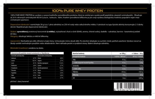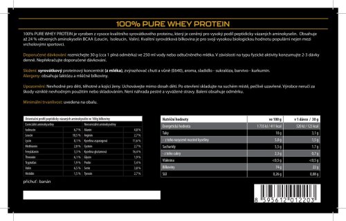 Syrovátkový proteinový nápoj s vysokým podílem pepticky vázaných větvených aminokyselin Bcaa (leucin, isoleucin, valin). Syrovátková bílkovina patří mezi nejlépe využitelné zdroje bílkovin díky snadné stravitelnosti a vysokému podílu esenciálních aminokyselin. Nápoj je vhodný ihned po fyzické aktivitě nebo kdykoli během dne pro doplnění kvalitních bílkovin ve stravě. Prémiový syrovátkový protein ze skandinávského mléka Proteinový nápoj 100% PURE WHEY PROTEIN je čistý syrovátkový koncentrát vyrobený šetrnou ultrafiltrací z mléka původem z Dánska. Syrovátková bílkovina má vysoký podíl esenciálních aminokyselin včetně peptidicky vázaných aminokyselin BCAA, kterých obsahuje 23,7 %. Ideální výživa po tréninku nebo pro doplnění bílkovin během dne Syrovátkový protein patří mezi ideální zdroje bílkovin po fyzické aktivitě. Jedna dávka (30 g) poskytuje 22 g bílkovin, což je optimální dávka bílkovin po tréninku. Bílkoviny přijaté po sportovní aktivitě usnadňují regeneraci a přispívají k růstu a udržení svalové hmoty. 100% Pure Whey Protein má univerzální využití. Vedle užívání v podobě proteinového šejku po tréninku je možné protein použít do snídaňových vloček nebo na přípravu proteinových dezertů a koláčů. 100% PURE WHEY PROTEIN v bodech: