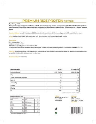 Vysoce kvalitní rýžový proteinový koncentrát doplněný o volný l-lysin. Proteinový nápoj obsahuje 70 % bílkovin výhradně z rýže, je přirozeně bez lepku a laktózy a neobsahuje umělá barviva. Díky kompletnímu profilu esenciálních aminokyselin je rýžový protein svou kvalitou srovnatelný s živočišnými bílkovinami včetně mléčných proteinových nápojů. Aminokyselinové spektrum doplněné o volný l-lysin Rýžová bílkovina má přirozeně nízký obsah l-lysinu, čímž klesá celková využitelnost bílkoviny pro lidský organismus. V receptuře PREMIUM RICE PROTEINu je proto l-lysin přidaný ve volné formě, aby zastoupení esenciálních aminokyselin bylo plnohodnotné. Díky vysoké proteinové stravitelnosti se tak proteinový nápoj může pyšnit vynikajícím skóre kvality bílkovin (PDCAAS = 0,99), které odpovídá těm nejkvalitnějším proteinovým nápojům na trhu. Rýžový proteinový nápoj je vhodný pro vegetariány a vegany.