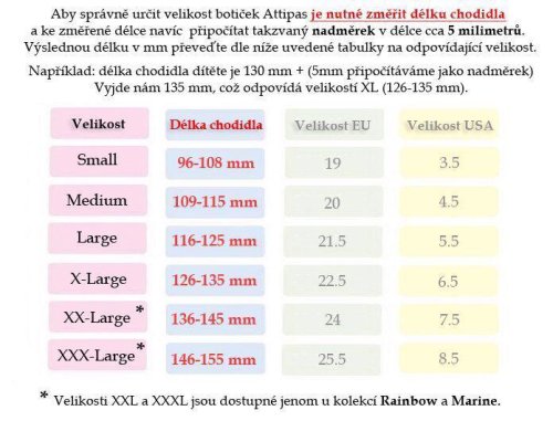 Obuv Attipas je vhodná pro děti od 6 měsíců do 3 let. Botičky jsou určeny jak pro děti, které teprve začínají chodit, tak i pro dobré chodce. Obuv Attipas je extrémně měkká, flexibilní a kopíruje tvar nohy dítěte s cílem usnadnit přirozený vývoj dětských nohou.