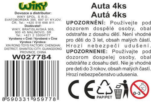 Auta 4 ks. Velikost 6,5 cm. Volná kola. Více variant.
