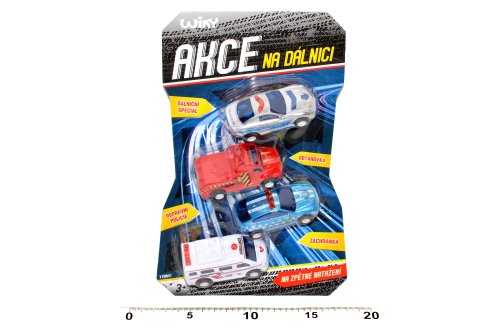 Sada autíček - akce na dálnici. Délka 7 cm. Balení obsahuje 4 ks. Pohon na zpětné natažení.