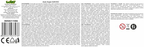 Auto 87 Super driftující svítící RC na dálkové ovládání. Rozměry 20x8x6 cm. Frekvence 2.4GHz. Pistolový ovladač. Součástí 4 standardní a 4 driftující kola. Světelné efekty povrchu auta tlačítkem na ovladači. Bateriový pack 3.7V 500mAh lithium do auta součástí, 2xAA do ovladače nejsou součástí. Try Me tlačítko pro světelné efekty v obalu - 3xAG13 baterie (neměnitelné) součástí. Při vybalování nutno odpojit Try Me kabel z auta. USB kabel součástí. Rychlost 12 km/h. Provoz až 20 min, nabíjení 2 h, dosah až 40 m. Přepínač ON/OFF na spodní straně auta a na ovladači.