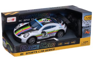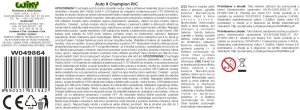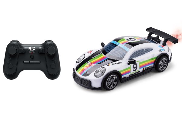 Auto 9 Champion svítící dýmící RC na dálkové ovládání. Rozměry 19x8x6 cm. Frekvence 2.4GHz. Světelné efekty povrchu auta. Dýmící efekty. Bateriový pack 3.7V 500mAh do auta součástí, 2xAA do ovladače nejsou součástí. USB kabel součástí. Přepínač ON/OFF na spodní straně obalu. Ovladač - přepínač ON/OFF, tlačítko - dýmící efekty, tlačítko - zvukové efekty. Nádržka na vodu v zadní části auta před křídlem.
