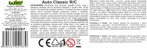 Auto Classic RC na dálkové ovládání. Rozměry 29x22x21 cm. Frekvence 27MHz. 4xAA baterie do auta, 2xAA do ovladače nejsou součástí. Provoz 15-20 min, dosah 10-15 m. Přepínač ON/OFF na spodní straně auta a na ovladači.