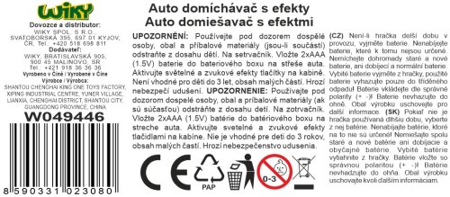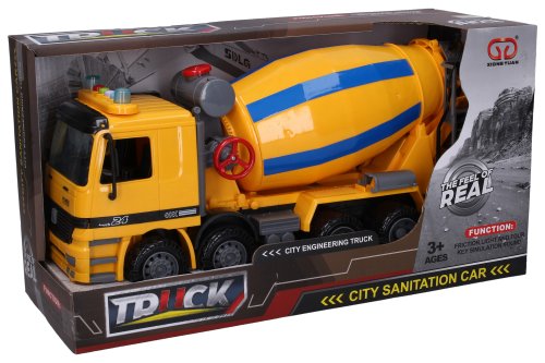 Auto domíchávač s efekty. Velikost 40 cm. Na setrvačník. Světelné a zvukové efekty tlačítky na kabině. 2xAAA baterie do bateriové boxu na střeše nejsou součástí. Točením ovládacího kola na boční straně se otáčí míchací část auta.