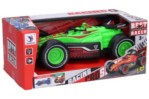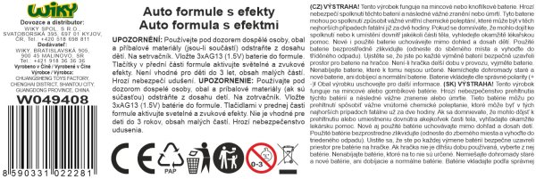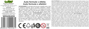 Auto formule na setrvačník s efekty. Rozměry 21,5x11,5x7,5 cm. Vydává světelné a zvukové efekty. Aktivace tlačítky v přední části formule - zvuk startu motoru a startovních světel, zvuk jízdy. 3 varianty - žlutá, červená, modrá. Baterie 3xAG13 1,5 V, součástí balení.
