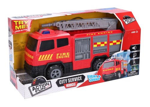 Pozor, poplach! Zavolejte hasiče! S hasičským autem bude každý malý hasič vždy připraven k zásahu! Auto hasiči na setrvačník s efekty. Velikost 30 cm. Světelné a zvukové efekty, aktivace tlačítkem na střeše. Vysouvací žebřík na střeše. Pohon na setrvačník.