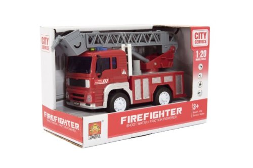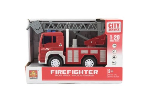 Plastové autíčko pro malé hasiče je vyrobeno z kvalitního plastu. Model jezdí na setrvačník, vydává zvuky a bliká. Auto má vysouvací žebřík a můžete stříkat vodu jako opravdový hasič. Kupte dětem hasičský vůz! Velikost dodávky je 20 cm. Baterie 3x AG13 jsou součástí balení a slouží pouze pro zkušební účely. Rozměry balení 24 x 16 x 12cm. Vhodné pro děti od 3 let.