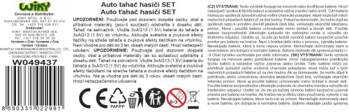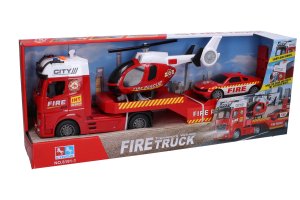 Auto hasiči tahač a helikoptéra s efekty set. Velikost tahače 55x11x17,5 cm. Vydává světelné a zvukové efekty. Na setrvačník. Obsah balení - tahač 55 cm, helikoptéra 27 cm, auto 16 cm. Tahač - maják zvuk a světla, zvuk couvání, zvuk motoru - aktivace tlačítky na střeše. Helikoptéra - zvukové efekty - aktivace tlačítkem na boku. Baterie 6xAG13 (LR44) 1,5V, součástí balení (3x náklaďák, 3x helikoptéra).