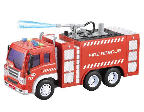 Hasičský vůz s vodním dělem, 27 cm. 4 tlačítka s různými světelnými a zvukovými efekty. Funkční vodní dělo. Nádržka na vodu se nachází na střeše auta, uzavřená černou zátkou. Šedým tlačítkem na střeše se pumpuje voda do vodního děla. 3xAG13, součástí. Try me funkce na obalu.