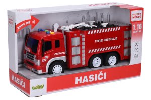 Auto hasičské se stříkačkou a efekty. Velikost 28 cm. Na setrvačník. Světelné a zvukové efekty - tlačítka na kabině. 3xAG13 baterie součástí.