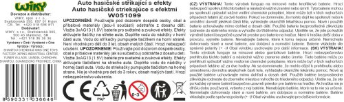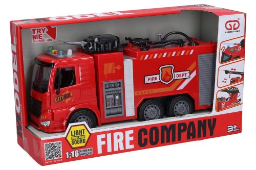 Auto hasičské stříkající s efekty. Velikost 30 cm. Na setrvačník. Světelné a zvukové efekty, aktivace tlačítky na kabině. 3xAG13 baterie do střechy kabiny součástí. Nádržka na vodu se nachází uvnitř cisterny, zajištěna zátkou na střeše. Stříkání tlačítkem na nádržce.