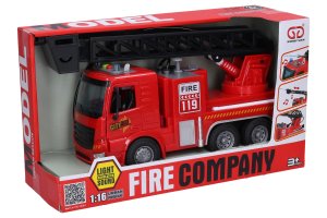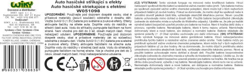 Auto hasičské stříkající s efekty. Velikost 30 cm. Na setrvačník. Vydává světelné a zvukové efekty, aktivace tlačítky na kabině. 3xAG13 baterie do střechy kabiny součástí. Nádržka na vodu se nachází uvnitř cisterny, zajištená zátkou na střeše. Stříkání tlačítkem na nádržce.