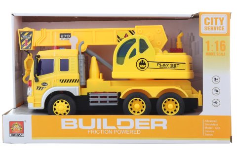 Auto jeřáb na baterie. Po stisknutí tlačítek vydává zvuky a svítí. Rozměry auta cca 28 x 14 cm. Rozměry balení cca 32 x 19 x 12 cm. Napájení 3x AG13 (je součástí balení). Věk 3+