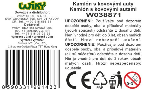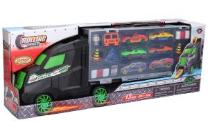 Auto kamión s auty. Velikost kamiónu 48 cm, aut 7 cm. Kabina kamiónu průjezdná auty. Součástí kamión s volnými koly, úložnou plochou a držadlem, 4 auta s volnými koly, barely, kužely, zábrana.