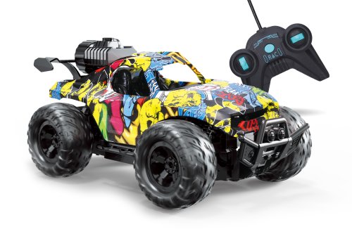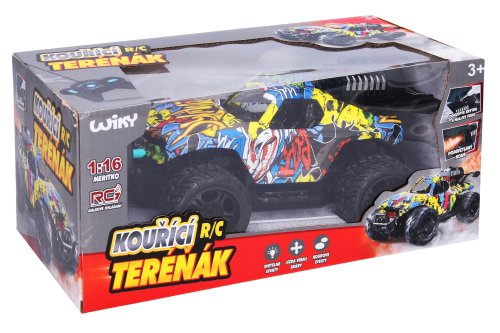 Auto terénní graffiti RC na dálkové ovládání. Rozměry 24x14,5x10,6 cm. Frekvence 40 MHz. Světelné a kouřové efekty. 4xAA baterie do auta a 2xAA baterie do ovladače nejsou součástí. Přepínač ON/OFF na spodní straně auta. Voda se plní na zásobníku v horní zadní části auta. Nádobka na vodu součástí. Tlačítko mezi páčkami na ovladači - stisk aktivace kouře - dvojí stisk vypnutí kouře.