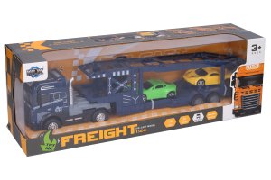 Auto kovové tahač s auty na setrvačník set. Délka 42 cm. Vydává světelné a zvukové efekty. Aktivace pohybem předních kol. Obsah balení - tahač s efekty na setrvačník 42 cm, 2x auto 9 cm volná kola. Páčka na uzamčení návěsu. Návěs je možné odpojit. Baterie 3xAG13, součástí balení.