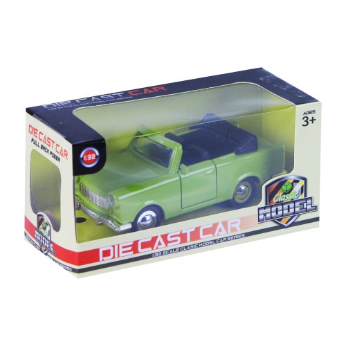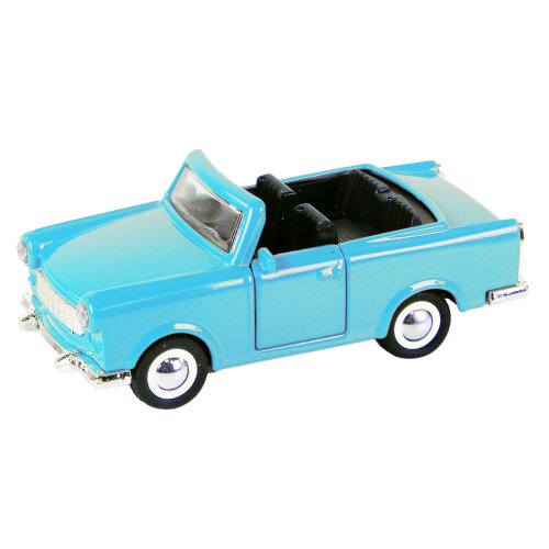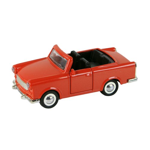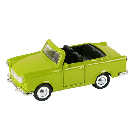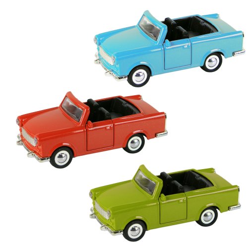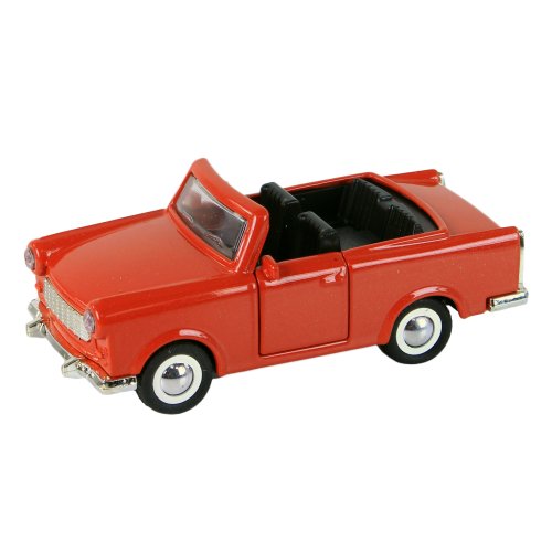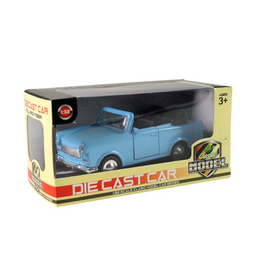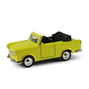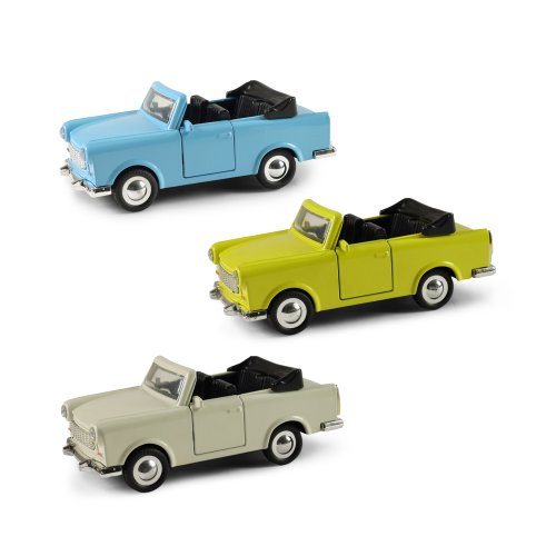 Kovové auto trabant kabriolet v různých barvách. Auto jezdí na zpětný setrvačník. Nostalgie na čtyřech kolech. Měřítko 1:32.