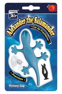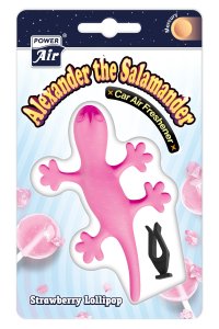 Hravý osvěžovač vzduchu POWER AIR Alexander ve tvaru mloka k upevnění do mřížky ventilátoru automobilu.