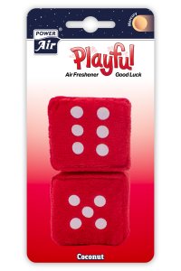 Dekorativní plyšový osvěžovač POWER AIR Good Luck v podobě hracích kostek k volnému zavěšení do prostoru.K dispozici v červené a černé barvě.Oba motivy spojuje svěží vůně čerstvého kokosu, která provoní …