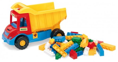 Barevný nákladní vůz z kvalitního plastu veze na své sklopné korbě hromadu různých stavebních dílků, ze kterých si děti mohou postavit stavby podle vlastní fantazie. Vhodné od 12 měsíců.