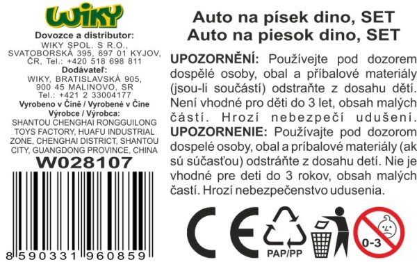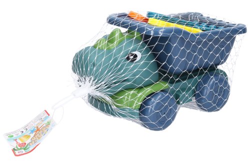 Auto na písek dino sklápěcí. Délka 27 cm. Se sklápěcí korbou. Obsah balení - auto, sítko 2x lopatka, 2x formička. Volná kola.