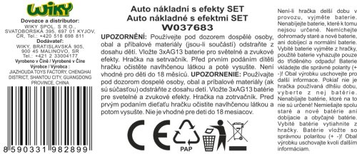 Auto nákladní set 4ks. velikost auta 26cm. Obsahuje velké auto, 2malé auta 7cm, 2 panáčky. Světelné a zvukové efekty (melodie, motor, maják). Setrvačník. Baterie 3xAG13 součástí.