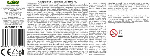 Auto policejní City Hero RC na dálkové ovládání. Velikost 32 cm. Frekvence 2.4GHz. Pistolový ovladač. Světelné efekty. Bateriový pack 7.4V 500mAh Li-ion do auta součástí, 2xAA do ovladače nejsou součástí. USB kabel součástí. Přepínač ON/OFF na spodní straně auta a na ovladači.