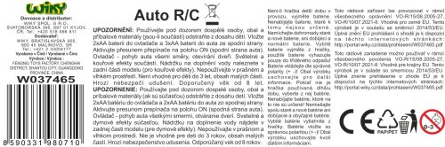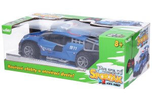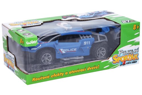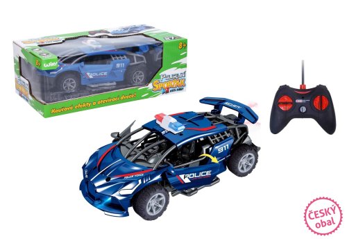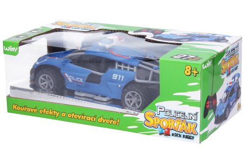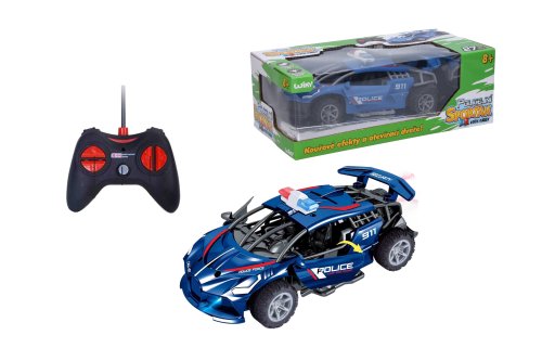 Auto policejní RC na dálkové ovládání. Velikost 21 cm. Frekvence 27MHz. Dálkově otevírací dveře. Světelné a kouřové efekty. 3xAA baterie do auta, 2xAA do ovladače nejsou součástí. Přepínač ON/OFF na spodní straně auta. Tlačítko na ovladači - otevírání dveří. Nádrž v zadní části před křídlem. Nádobka na vodu součástí.
