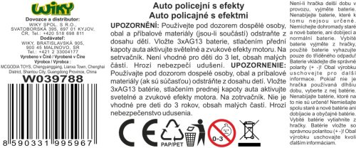 Auto policejní s efekty. Rozměry 18x8,8x6 cm. Na setrvačník. Světelné a zvukové efekty motoru stlačením přední kapoty. 3xAG13 baterie součástí. 2 varianty - modré, šedé.