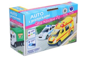 Auto policejní - Míša Růžičková. Velikost 15,5 cm. Na setrvačník. Světelné a zvukové efekty, tlačítky na střeše auta 3 písníčky Míši Růžičkové - Policejní, Sanitka, Popeláři. 3xAG13 baterie součástí.