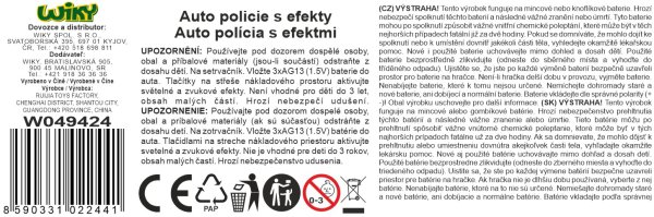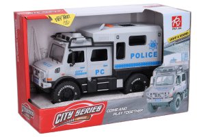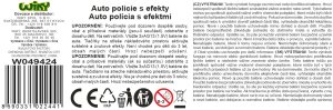 Auto policie obrněné s efekty. Rozměry 24,4x9,8x13,5 cm. Na setrvačník. Vydává světelné a zvukové efekty. Aktivace tlačítky na střeše. Zvuky motoru, couvání, troubení, maják. 3xAG13 baterie, součástí balení.