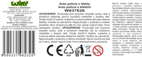 Auto policie s efekty. Velikost 23cm. zvukové (zvuk motoru, couvání, maják) a světelné efekty. Baterie 3xAG13 součástí. Setrvačník.