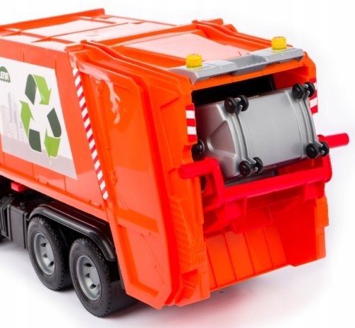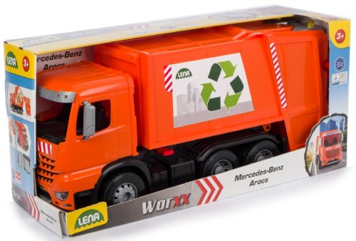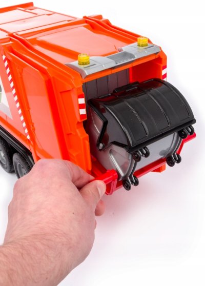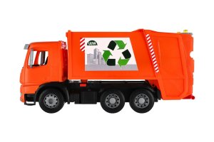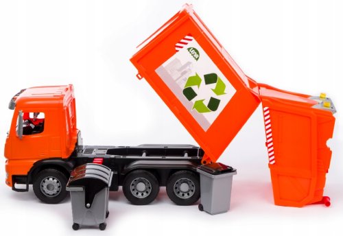 Mercedes Arocs popelář. 6mm tlusté kovové osky u kol. Součástí je pojistka proti nežádoucímu vyklopení. 1x malá + 1x velké popelnice. Vyrobeno v ČR