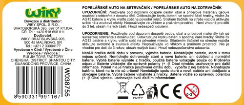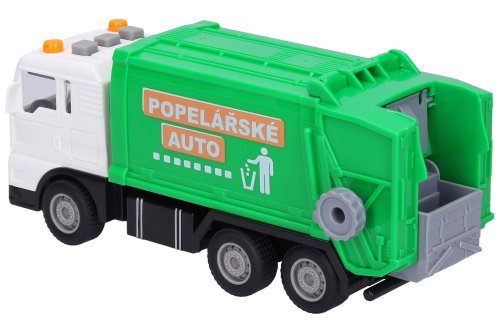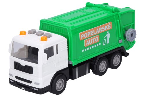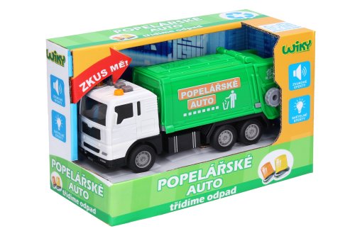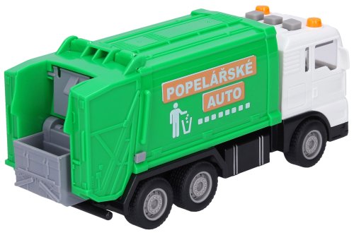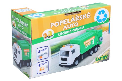 Auto popelářské. Velikost 17 cm. Na setrvačník. Světelné a zvukové efekty tlačítky na kabině. 3xAG13 baterie součástí.