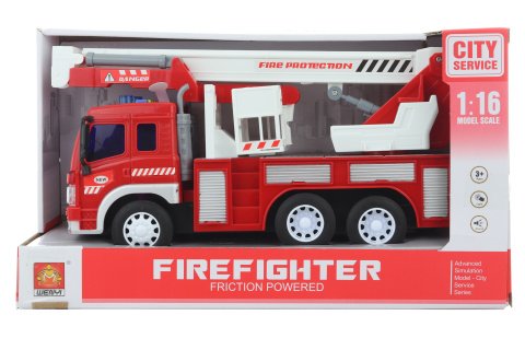 Hasičcké auto na baterie. Po stisknutí tlačítek na kapotě vydává zvuky a svítí. Rozměry auta cca 27 x 14 cm. Rozměry balení cca 32 x 18,5 x 12 cm. Napájení 3x AG13 (je součástí balení). Věk 3+