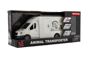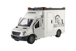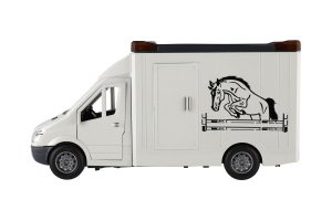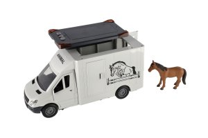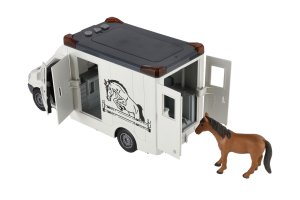 Auto pro převoz koní na setrvačník. Všechny dveře se dají otevřít. Součástí balení je postavička koně. Velikost auta je 28 cm a má světelné a zvukové efekty. 2x AA baterie jsou součástí balení. Rozměry balení 39 x 18 x 12 cm. Vhodné pro děti od 3 let.
