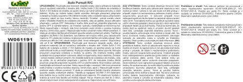 Auto Pursuit 001 s efekty RC na dálkové ovládání. Rozměry 29x11,8x7,5 cm. Frekvence 2.4GHz. Světelné efekty povrchu a zvukové efekty auta. 4xAA baterie do auta, 2xAA do ovladače nejsou součástí. Try Me tlačítko pro světelné a zvukové efekty v obalu - 3xAG13 baterie (neměnitelné) součástí. Při vybalování nutno odpojit Try Me kabel z auta. Rychlost 10 km/h. Dosah až 35 m. Přepínač ON/OFF na spodní straně auta a na ovladači.