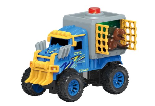 Plastové auto velikosti 20 cm, volnoběh, po stlačení majáku se otevřou dvířka a vykoukne dinosaurus, kteří řve.