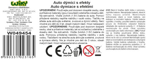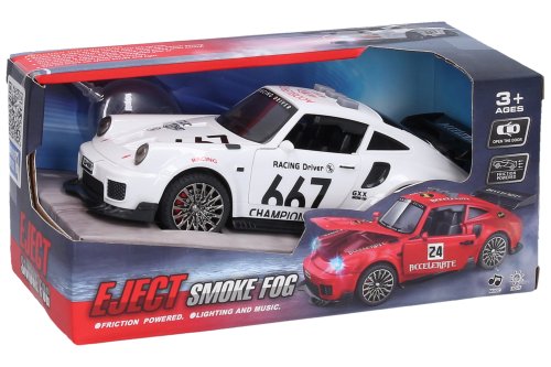 Auto s kouřovými efekty. Rozměry 15,5x6,7x5,5 cm. Otevírací kapota a dveře. Vydává světelné, zvukové a kouřové efekty. Aktivace tlačítky na střeše (zvuk motoru, zvuk sirény, hudba). Baterie 2xAAA, nejsou součástí. 3 varianty - červená, černá, bílá.